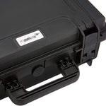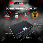 - Koffer IP67 zertifiziert (Unterwasserdicht für 30 Minuten in 1 Meter Wassertiefe), 100% staubdicht, doppelter Sicherheitsverschluss, abschließbar, Gummidichtung und automatisches Druckausgleichsventil, schlag- und stoßfest. Handgepäckmaße: 464 x 366 x H 176 mm, Gewicht: 3,7 KG.